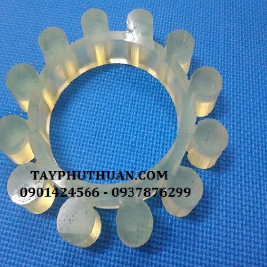 Vòng đệm nhựa PU phi 206xcao30, Khớp nối cách tròn PU 12 cánh dày 45mm, Nhựa PU nhân tạo đàn hồi chịu lực. Đệm cao nhựa PU, cánh cao su khớp nối hoa thị được làm bằng nhựa PU màu vàng, không cần qua thiết kế khuôn. Cty chúng tôi nhận gia công theo bản vẽ bằng gia công cơ khí CNC và tiện 1 cách chính xác.